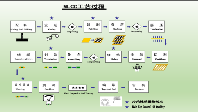 MLCC(다중 레이어 세라믹 커패시터)는 널리 사용되는 커패시터 유형입니다. 그것의 구조는 내부 전극으로 인쇄 된 인터리브 및 스태킹 세라믹 유전체 필름에 의해 형성되어 고온에서 소결되어 세라믹 블록을 형성 한 다음 양쪽 끝에서 금속 층을 밀봉한다. 세라믹 유전체, 금속 내부 전극 및 금속 외부 전극의 세 부분으로 구성됩니다.MLCC소량, 대규모 커패시턴스, 고주파에서의 낮은 손실, 대량 생산에 대한 적합성, 저렴한 가격 및 우수한 안정성의 장점이 있습니다. 가볍고 얇고 짧고 작은 정보 기능 제품의 요구 사항을 충족하며 현대 전자 제품에서 중요한 구성 요소입니다. 제조 공정은 무엇입니까?MLCC?